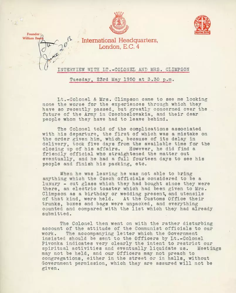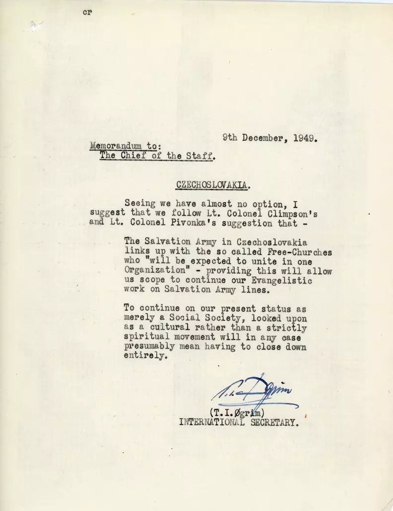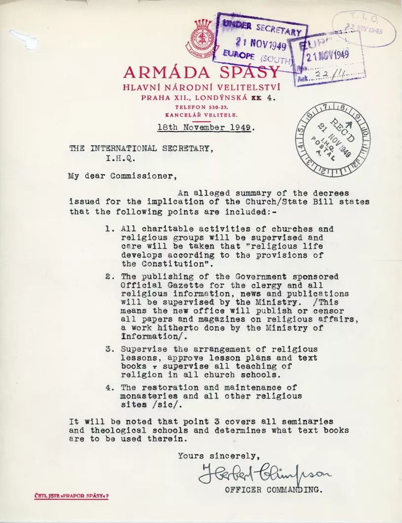 In 1949, the government of Czechoslovakia issued the Church/State Bill, which sought the nationalisation of churches in order to bring all institutional religion under the strict control of the State. Lieutenant-Colonel Herbert Climpson was the Officer Commanding for The Salvation Army in Czechoslovakia during this time. His correspondence, catalogued in the Europe Zonal Department papers [EUZ/8/1/1], allows an insight into the situation unfolding and the pressure the Army was subjected to. Writing to Commissioner Ogrim, the International Secretary, on 17 November 1949, Climpson recounts an ‘interview’ he had with an official from the ‘recently created State Office for Church matters’. During this meeting he is questioned as to why The Salvation Army was operating as a Society and ‘not a clearly registered religious body’ and asked as to whether the Army would like to be ‘included in the scope of the new law as a religious society’. Climpson clarifies that this new law states that ‘all religious leaders are to be paid by and approved by the State’. His letter goes on to discuss the options available for the Army but concludes that ‘Whatever decision is arrived at time alone will prove whether we would be permitted to continue on our aggressive activities on present lines…’ A further letter dated 18 November 1949 gives an alleged summary of the issues for the implication of the Church-State Bill.