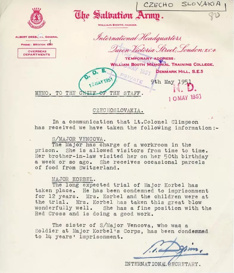 During the 1948 Czechoslovak coup d'état, the Soviet-backed Communist Party of Czechoslovakia seized control of the government and established a Communist Dictatorship that was to last for four decades. Papers from our archive detail the problems The Salvation Army experienced following the nationalisation of churches in Czechoslovakia in 1949, culminating in their eventual suppression in 1950.