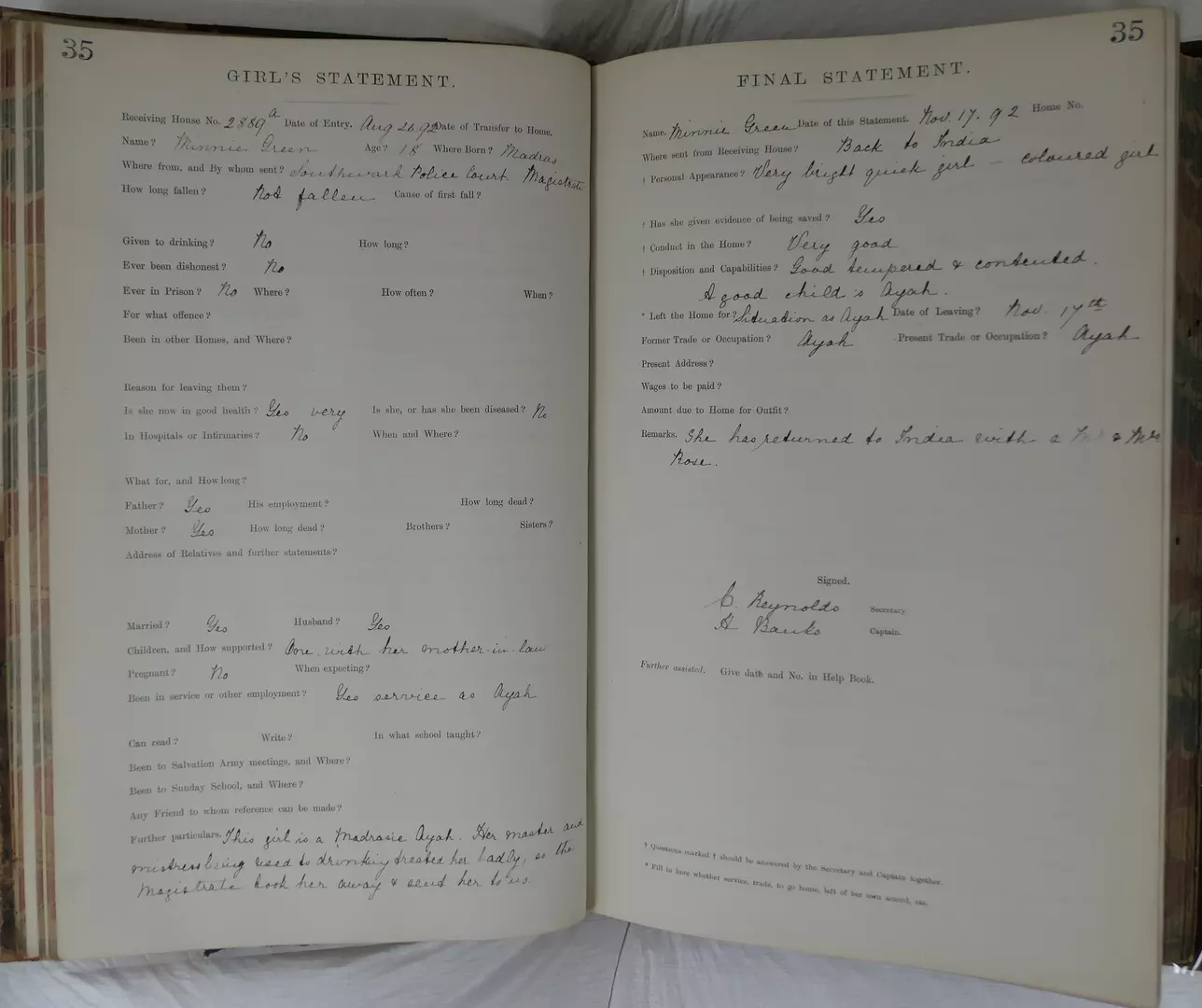 Minnie Green (18). Minnie was described as a ‘coloured girl’, an Ayah (nanny) born in Madras. Minnie had been treated badly by her master and mistress, both of whom drank heavily. As a result, ‘…the [Southwark] magistrate took her away & sent her to us.’ Her conduct in the home was described as ‘very good,’ and her disposition ‘good tempered and contented. Minnie was sent as an ayah to a Mr & Mrs Rose, who were returning to India.