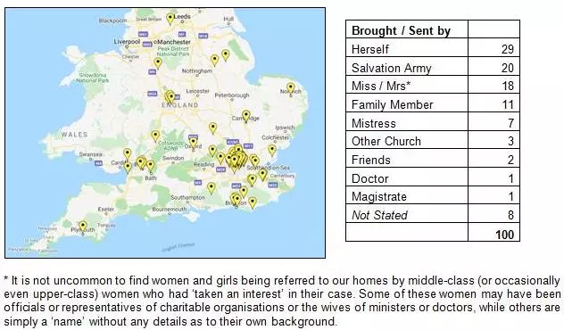 While many were local, some women and girls travelled long distances to the London receiving home. Among the group under study for example, two girls together ‘tramped’ from South Wales to London.