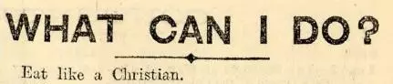 On 24 March 1894, however, the first line of the column, as if in direct answer to the question ‘what can I do?’, stated: ‘Eat like a Christian.’ The statement is not explained and no details are given; presumably it was left up to individual readers and their religious conscience to interpret what it meant.