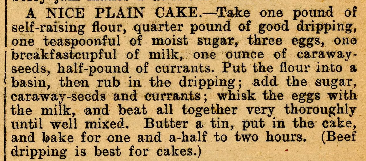 Last up for our baking blog highlights we have Steven’s ‘A Nice Plain Cake’; but, do not be fooled by the title for this cake is far from plain! Heading back to the Victorian era (just) with a recipe from January 1901, this recipe calls for all the usual suspects – flour, fat, sugar and eggs, as well as currants and caraway seeds for a denser texture and noticeable liquorice flavour. This recipe also provides the most conundrums of all with descriptions and measurements such as ‘moist sugar’, ‘one breakfastcupful’ and no advised oven temperature at all!