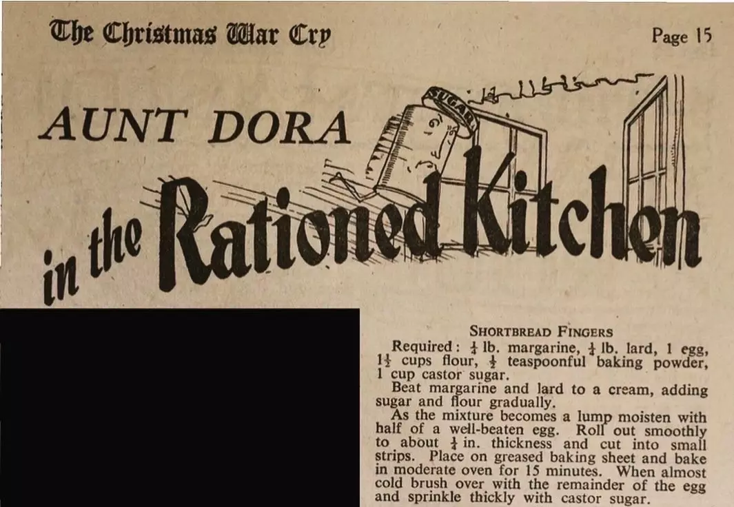Sadly, with the social restrictions of COVID-19, this year we are unable to come together and break bread (or cake) so we decided to do something a little different. Instead of retreating to our own cookery books, we went in search of archival recipes. For some years The Salvation Army’s newspaper, The War Cry, has offered up seasonal recipes and baking tips under its ‘Kitchen Corner’, ‘Betty Briggs’ recipes’ and ‘Aunt Dora’s Kitchen’; and these offerings, along with several manuscript sources that we have happened across over the years, have provided a store cupboard of historic recipes to whet our appetite.