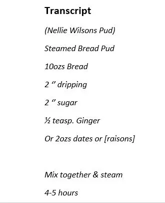 ‘Nellie Wilson’s Pud’, Cadets’ Cookery Notes, 1934 (WBC/1/2/2)