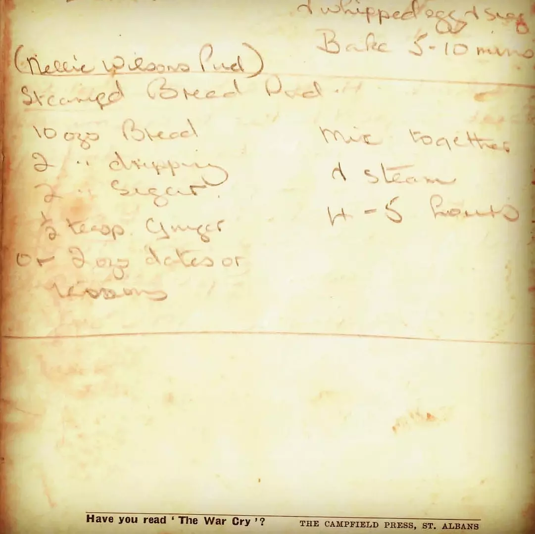 In a break from baking, Social Historian, Kevin, took over the next week with a rather special handwritten recipe - ‘Nellie Wilson’s Pud’. Scribbled in the back of the Cadets’ Cookery Notes, this recipe came from Lieutenant Nellie Wilson who worked in The Salvation Army’s Women’s Social Work department. We’re not sure how it found its way into the Cookery Notes, but we’re glad it did! This recipe called for a filling bread pudding flavoured with dates and ginger, with a simple method of ‘mix together and steam’, but a very lengthy 4-5 hours cooking time!