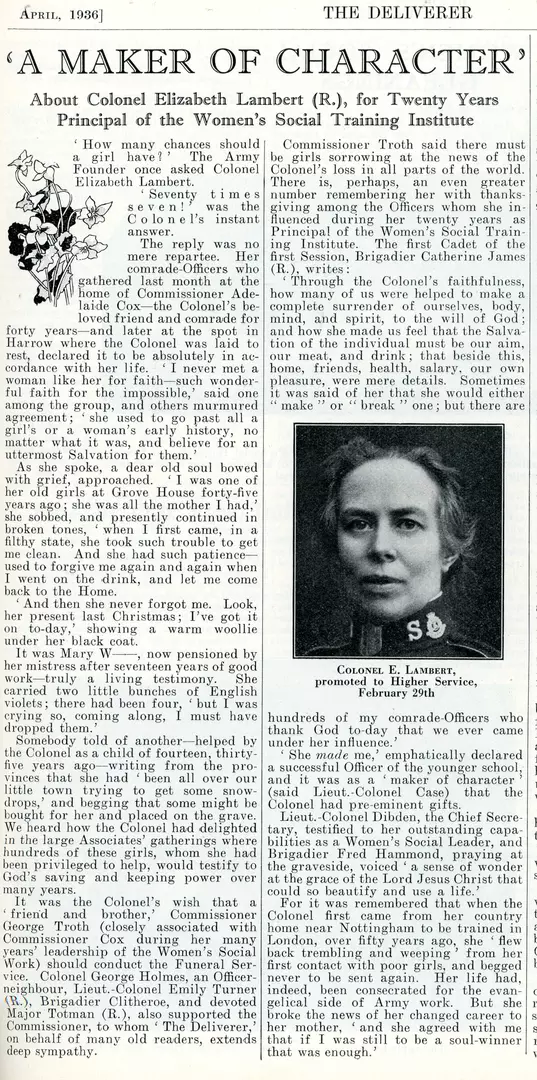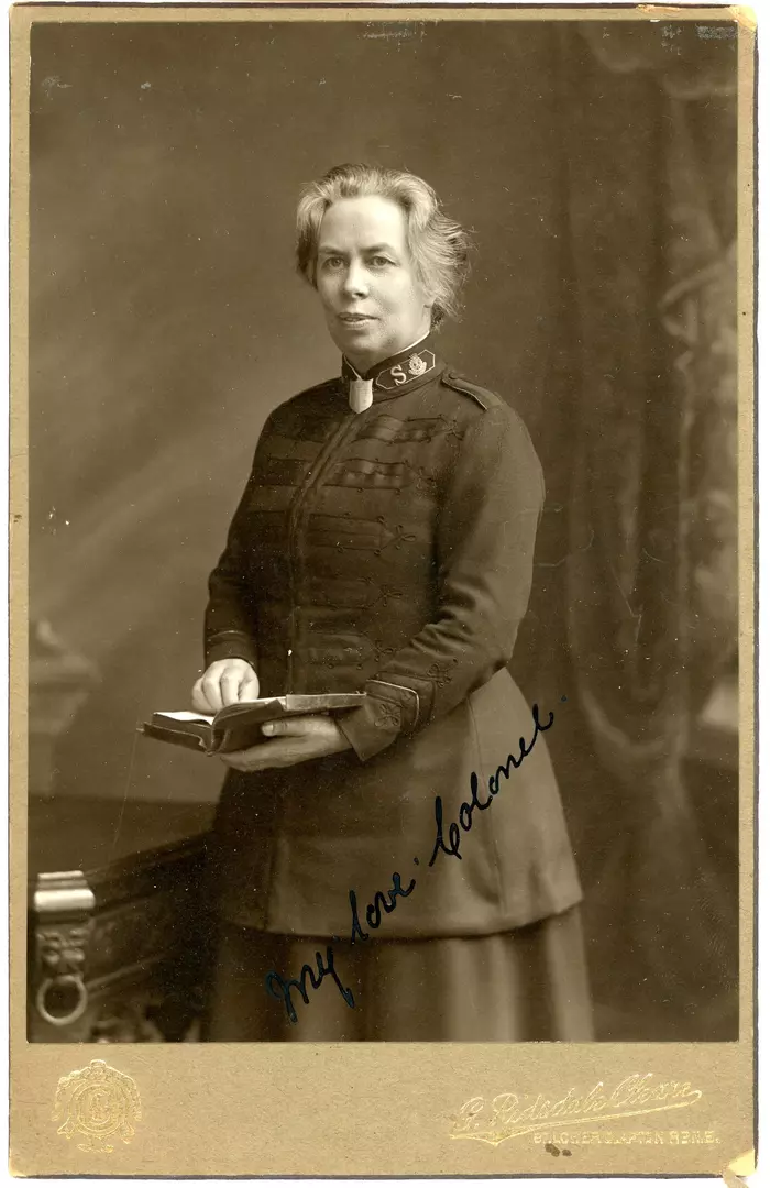 This cabinet card of a female officer was given to us without any information. None of our staff recognised the officer pictured but the hand-written dedication and the uniform indicate that she had the rank of Colonel. Cabinet cards with bevelled edges like this one were in production from the 1880s up until the beginning of the First World War, so for around 35 years, coinciding more or less with the first 35 years of The Salvation Army. Although, on paper, women officers in The Salvation Army have always had the same opportunities as men for promotion to a senior rank, in practice there were relatively few female Colonels during this period. Fortunately The Salvation Army Year Book, which has been published annually since 1906, includes a ‘Who’s Who’ of senior ranking staff officers, so using the 1914 Year Book it was possible to draw up a shortlist of eight women officers with the rank of Colonel or higher (not knowing the exact date of the photograph there was a possibility that the officer might have been promoted further between the time the photograph was taken and the end of the period of production for cabinet cards). By searching our archive catalogue for each of the names on the shortlist, the portrait could be compared with other photographs in our collections or in Salvation Army newspapers and magazines until eventually a match was found. This, it turns out, is Colonel Elizabeth Lambert who was the Principal of The Salvation Army’s Women’s Social Work Training Institute in Clapton.