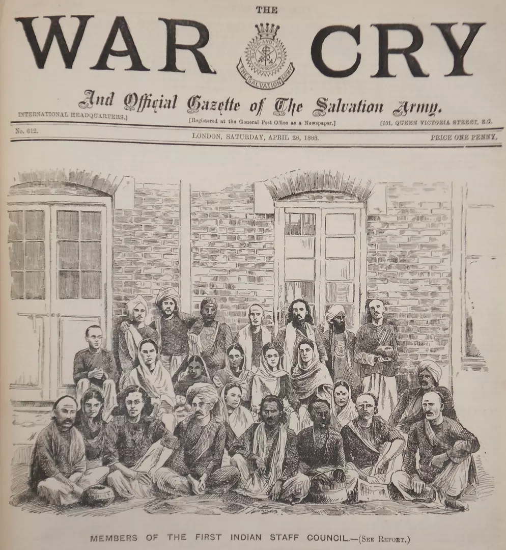 Knowing this, there was a relatively short window of opportunity for this photograph to have been taken. We could narrow our search down to the nine months between August 1887 and May 1888. A search of The War Cry newspaper for these months yielded results. On 28 April 1888, an illustrated reproduction of the photo appeared on the front cover of The War Cry. The photograph shows the members of the first Indian Staff Council, which took place in Bombay in early March 1888.