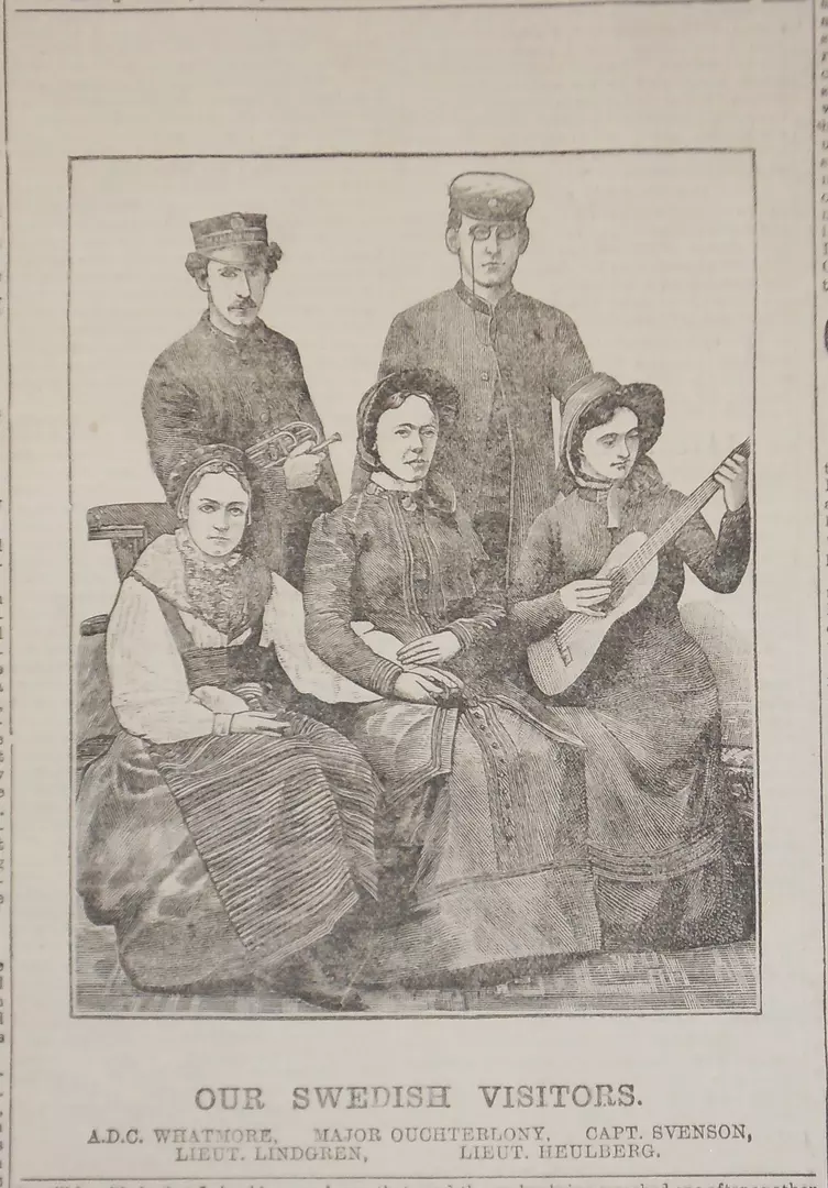 At first it seemed this reasoning might be correct. In July 1884 a party from Sweden visited London. The report above entitled ‘The Swedes on the War-Path in Cockney Land’ names the members of the party: Major Hanna Ouchterlony, Captain Hugh Whatmore, Captain Svenson, Lieutenant Lindgren, and Cadet Emanuel Hellberg. This last name rang a bell with us. A decade after this photograph was taken, Emanuel Hellberg married Lucy Booth, the youngest daughter of Salvation Army founders William and Catherine Booth. Comparing with later photographs we could pick out a possible candidate for Hellberg in the front row, next to Hugh Whatmore. In a drawing of the Swedish party that appeared in The War Cry a few weeks later, he seems to be recognisable from his distinctive glasses