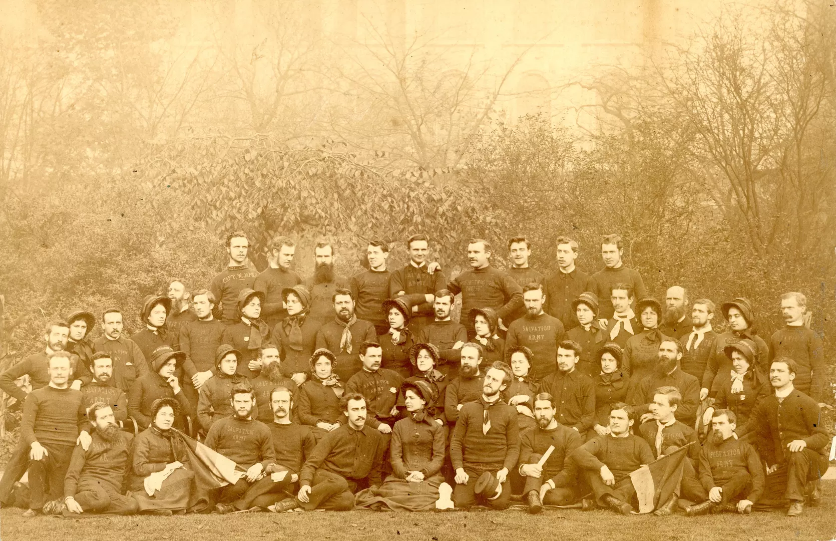 So, in want of further evidence, our best guess is that this photograph shows a group of attendees at the 1886 International Congress. The research undertaken to identify this early photograph has allowed us to re-catalogue it in a more detailed way, and if our identification is correct, it makes it one of only three known photographs of the first International Congress in our collection. It may also be the only photograph we have of Mrs Commissioner Elizabeth Smith, Captain Wallace James (shown in the back row with his name embroidered on his jumper) and many of the other unnamed sitters.