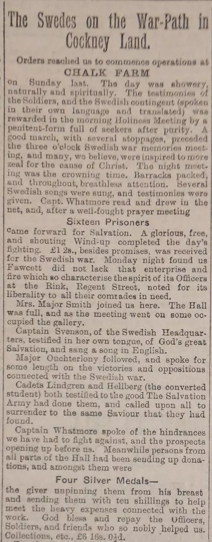 We then began to think that the positions of the sitters in the front row might serve as a clue. Were the most senior parties seated centre front and flanked by their assistants? Frank Smith is flanked by Elwin Oliphant, so could the woman flanked by Hugh Whatmore be Hanna Ouchterlony? The only confirmed photographs we have of Hanna Ouchterlony date from much later, so we couldn’t be sure when comparing this image with those but it seemed a fairly safe assumption to make. Could this have been a visit of Swedish officers to London or of London officers to Sweden? If so, it would surely have been reported in The War Cry and there was only a six-month window in which it could have occurred, so it was worth having a look.