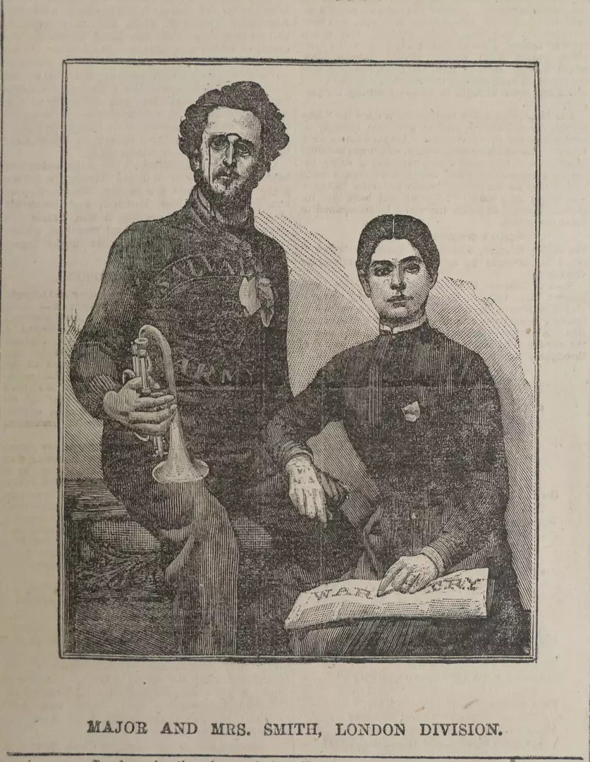There was another occasion during this time period when Salvationists of all nationalities came together in London—the 1886 International Congress. War Cry reports confirmed that Frank Smith, then Commissioner for the United States, and his Aide-de-Camp, Hugh Whatmore had brought a party to London for this occasion. A Swedish contingent including Emanuel Hellberg had also been present, and Major Elwin Oliphant was advertised as a notable attendee at various events during the Congress. An illustration of Frank Smith printed in The War Cry on 29 May 1886 shows him dressed in the same neckerchief as he wears in the group portrait, and the woman next to him in the middle of the front row also bears some resemblance to an illustration of his wife, Elizabeth, that was published in The War Cry some years earlier. Unfortunately, this is the only known representation we have of her for comparison.