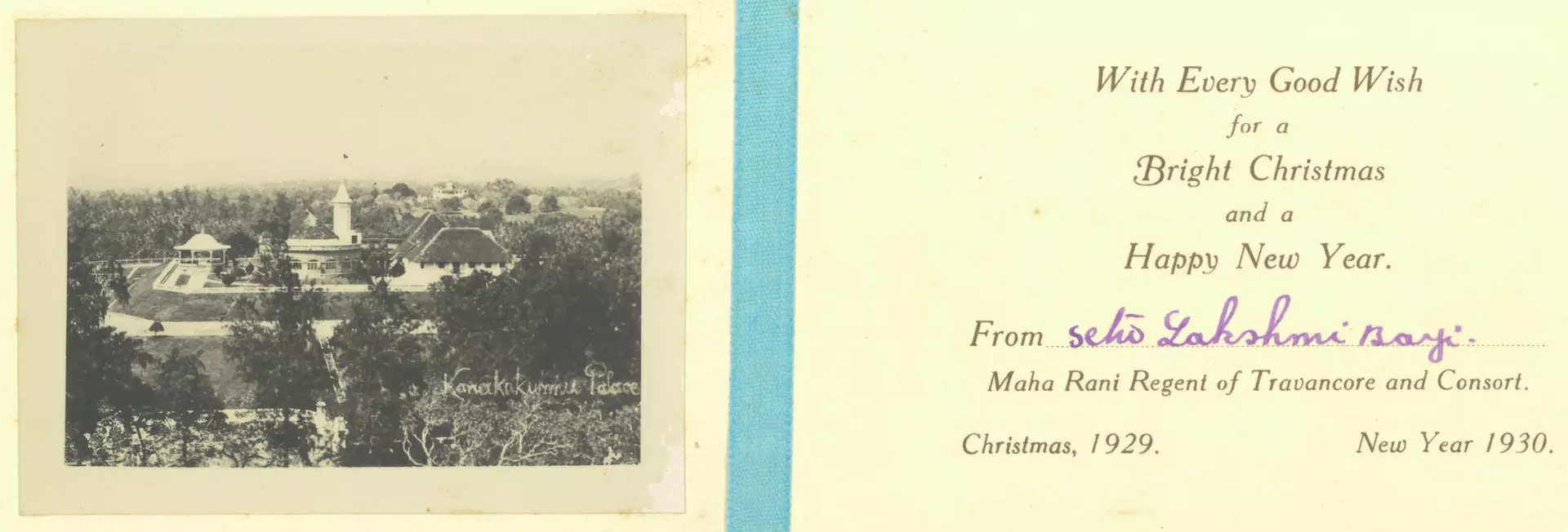 This prompted a search to find out how these prints came to be at the IHC and what connection they had to other records. We deduced that they were of the royal family of Travancore, South India and originally part of a collection of personal papers relating to Salvation Army officer Brigadier Mabel Poole (1892-1987). This collection already contained correspondence, photographs and a series of personal greetings cards (such as the one below) from various members of the Travancore royal family at their Kaudiyar and Satelmond palaces.