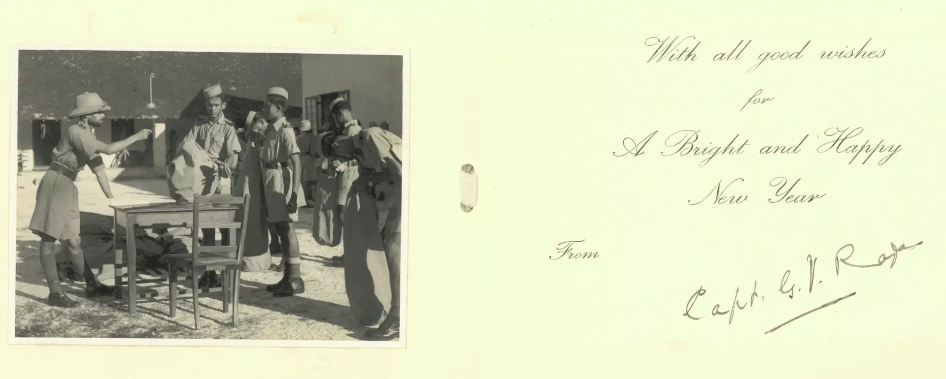 Again no names are given but after more research it seems this infant was Avittom Thirunal Rama Varma (1938-1944), born just three weeks before Poole’s was appointed to Special Duty. The ‘little prince’ was the eldest child of Sree Chithira Thirunal’s sister Karthika Thirunal Lakshmi Bayi (1916-2008) and her husband Godavarma Raja (1908-1971).Captain (later Lt-Colonel) G.V. Raja, as he was commonly known, is popularily remembered for his support and promotion of Keralan sport and tourism post-Indian independence. The Poole collection includes several signed greetings cards that he sent her, such as this card pictured below.