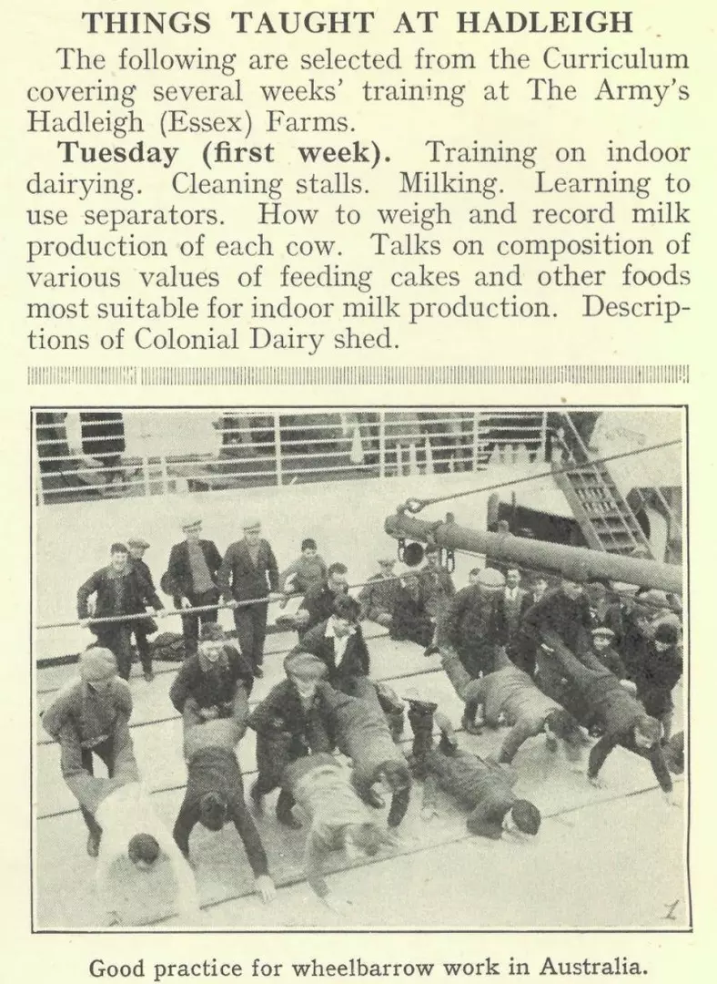 As the 1920s went on, the southern hemisphere began to welcome increasing numbers of Salvation Army emigrants, and young men in search of better job prospects were targeted once more. A new Boy’s Migration Scheme was inaugurated in 1923 and sent many parties to Australia and New Zealand in the course of the decade. Under the scheme, The Salvation Army’s Hadleigh Farm Colony in Essex was entirely turned over to training boys between the ages of 14 and 19 in preparation for agricultural jobs in the Dominions.