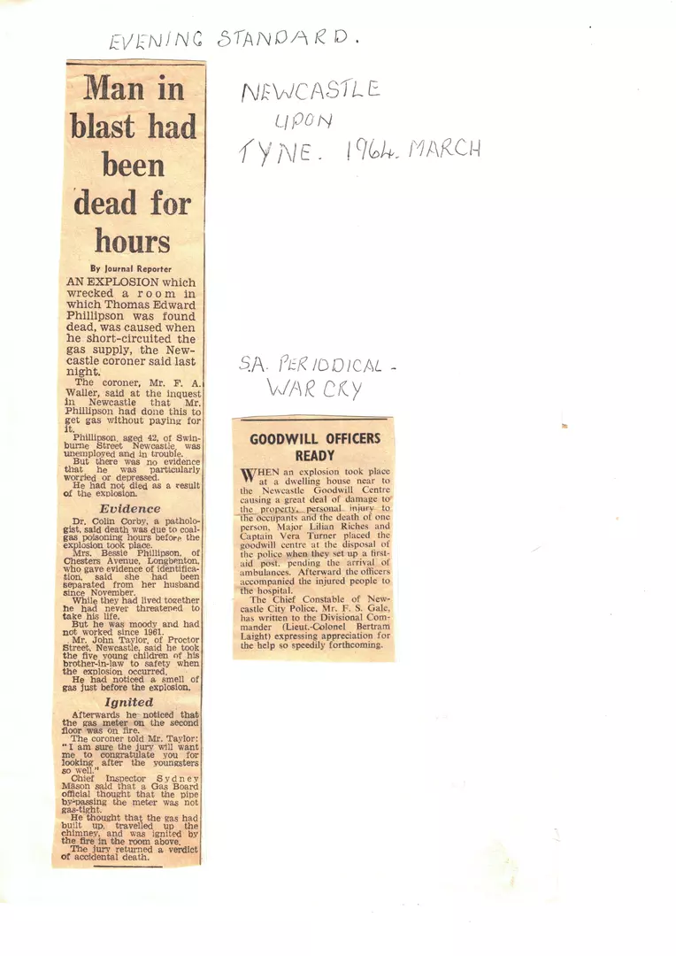 A pair of newspaper clippings among Lilian’s papers tell of a very sad episode in the Goodwill Centre’s first month when it was turned into a temporary first-aid post following a gas explosion in a neighbouring house. At first there was thought to have been one fatality from the explosion but a post-mortem subsequently revealed that the death had been caused by gas poisoning several hours before the explosion. It was discovered to be the tragic outcome of fuel poverty – an unemployed man who could not afford to pay for gas to keep himself and his children warm and fed during the winter months had attempted to short-circuit the gas supply. It is a stark example of the distress that made the Goodwill Centre needed in the area.