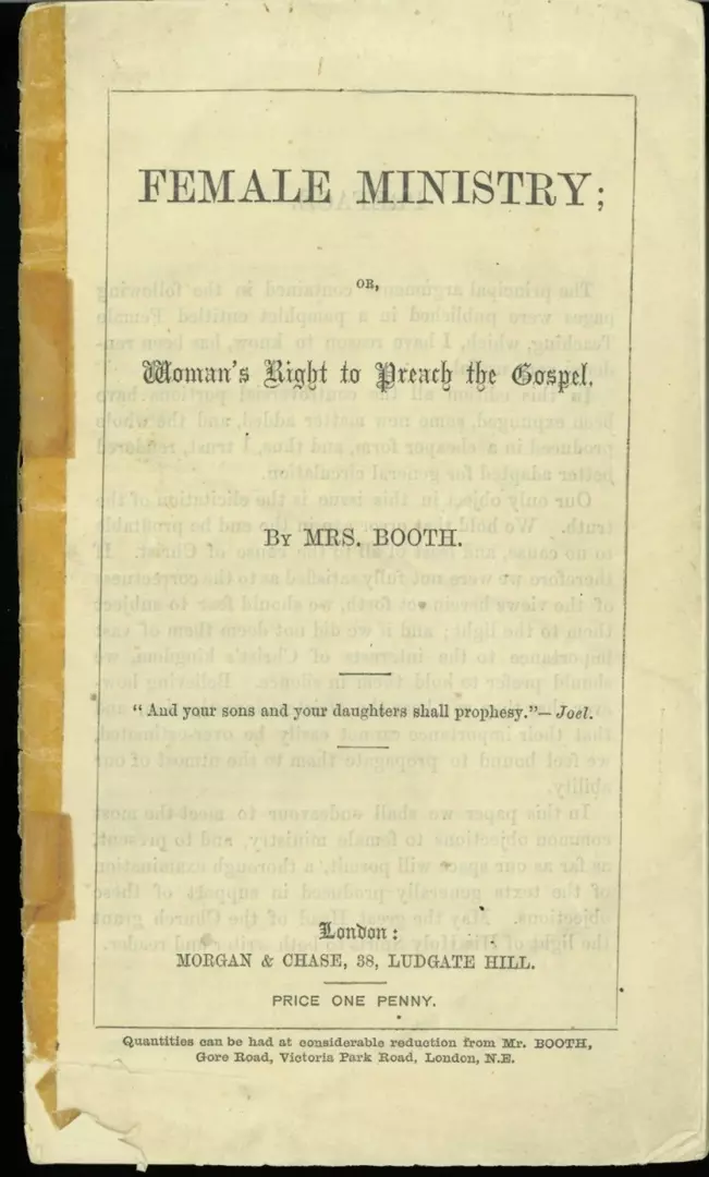 In her 1859 pamphlet, Female Ministry, she argued that: ‘God has given to women a graceful form and attitude, winning manners, persuasive speech, and, above all, a finely toned emotional nature, all of which appear to us eminent natural qualifications for public speaking’. Through this belief in women’s importance due to ‘essential differences’ between the sexes, Catherine Booth, whether politically motivated or not, implicitly aligned herself with the ‘equal but different’ branch of first wave feminism that became popular in the early 20th century.