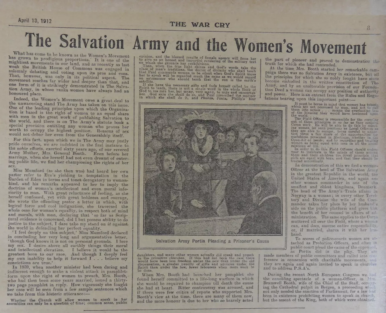 However, the activities of the women’s movement did not completely escape the attention of Salvationists in the early 20th century. In April 1912 The War Cry published an article that, while carefully avoiding any political discourse, expressed clear and enthusiastic support for the aims of the suffrage campaign. The article stressed that the women’s movement, as ‘one of the mightiest movements in our land’, owed a ‘great deal’ to The Army in having as one of its ‘leading principles…the right of women to an equal share with men’ – a statement that drew a direct parallel between Salvationist principles and those adopted by first wave feminists.