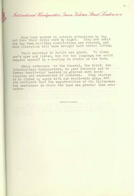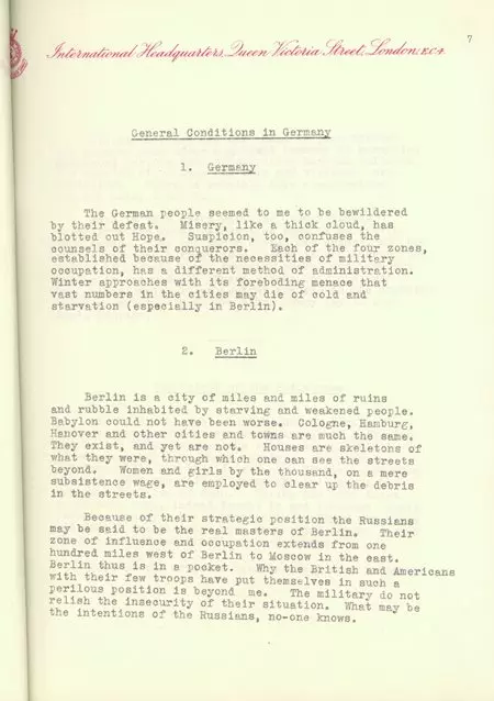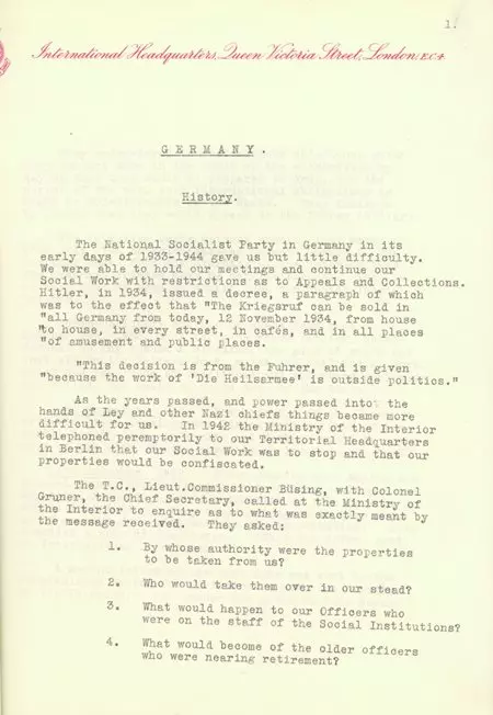 Following the rise to power of the National Socialist German Workers’ Party in Germany in 1933, The Salvation Army, which had worked in Germany since 1886, faced increasing pressure and restrictions under the Third Reich regime. Papers in our archive shed light on the work of the Army in Germany during the Second World War and allow an insight into the scale of the humanitarian crisis in the aftermath of the war. Here, I’ll highlight a report on Germany from the papers of Europe Zonal Department (Reference: EUZ) that recounts the situation in Germany through these years.