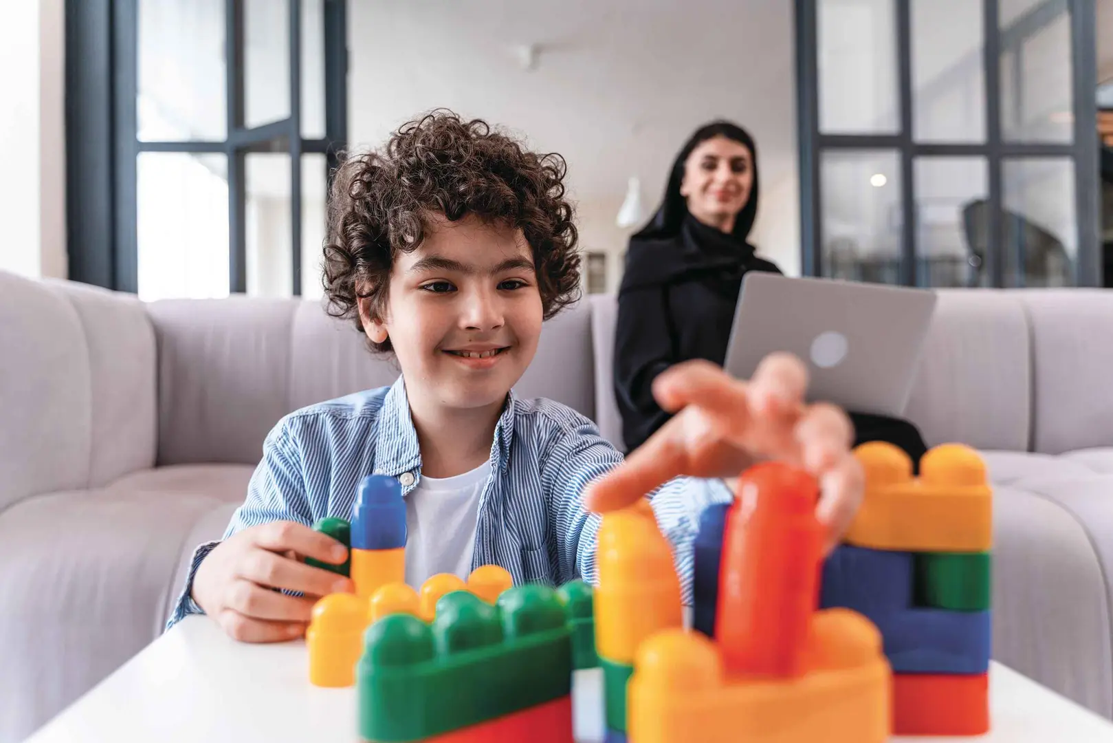 Young boy playing with toys, their mother looking on.