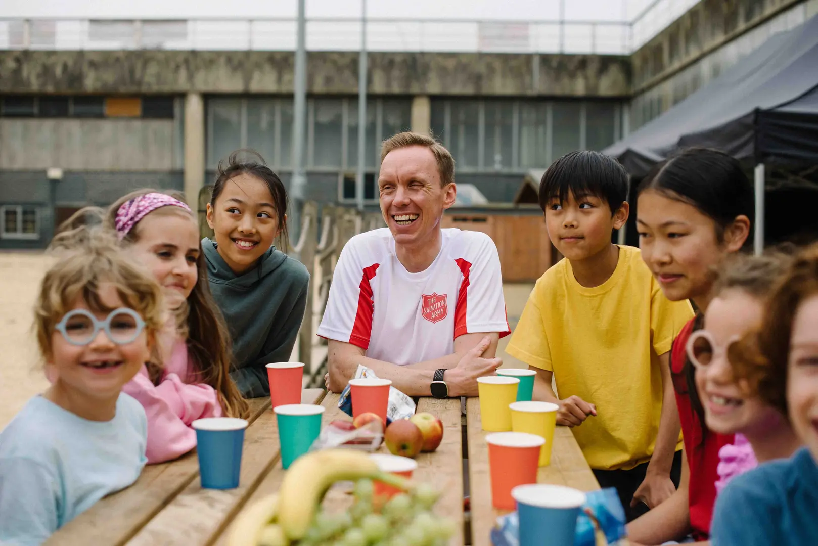 Image of children sat around a table, with a Salvation Army leader smiling