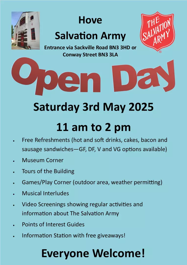 If you would like to attend any of our meetings or events but would appreciate meeting someone beforehand or at the door on the day, please email us at Hove@salvationarmy.org.uk for the attention of Mandy or Jean - Online via our Facebook group "Hove Corps Live"