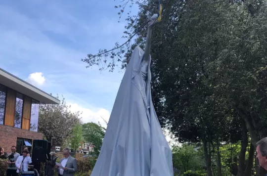 A statue of a person covered at an unveiling