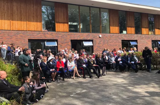 A large group of people sitting in front of a building attending an unveilling ceremony of a peace monument