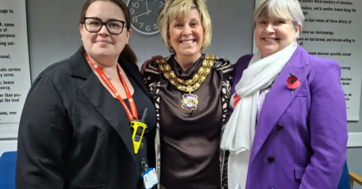 Highworth Mayor Councillor Julie Murphy flanked by Maz Hyde (left) Gloucester House Programme Manager and Deborah Toomey (right) Gloucester House Service Manager.