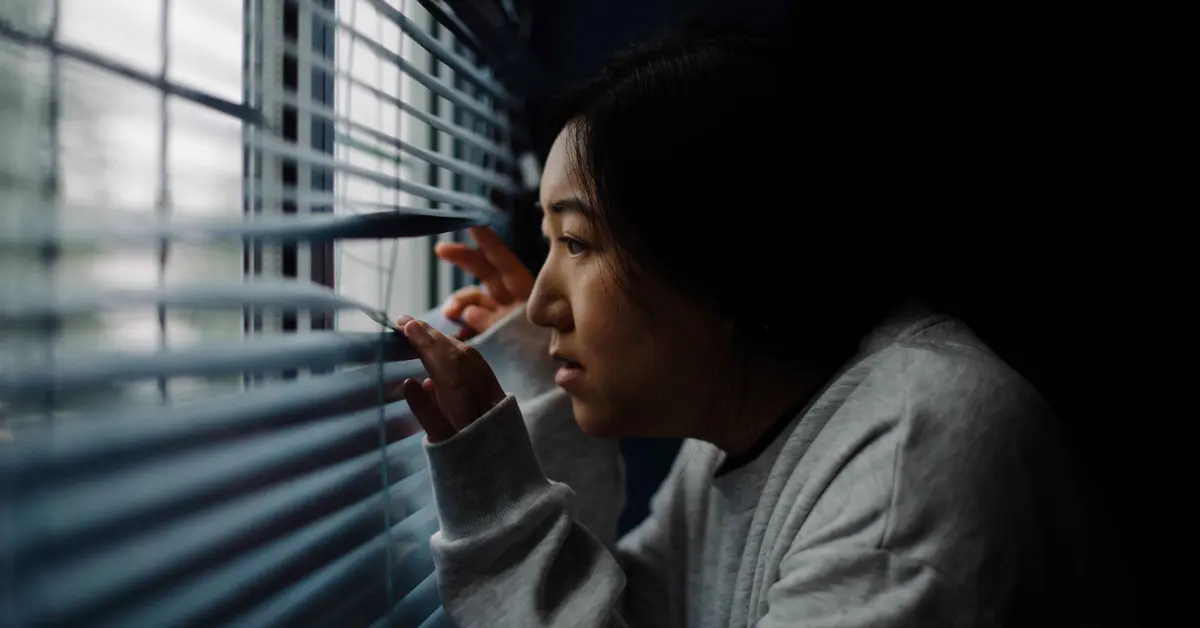 A young woman wearing a grey jumper peers through the blinds, she looks afraid.