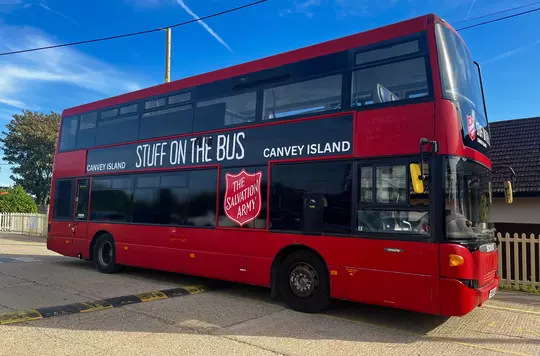 All aboard Salvation Army’s new community supermarket 13 Oct 2023 Launch of new community supermarket with a difference in Canvey Island - on a double decker bus.